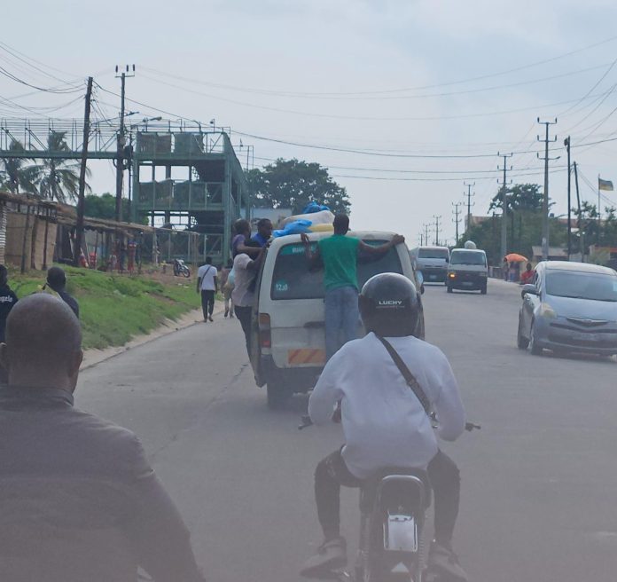 Os “chapa-100” que estão a circular andam lotados, tanto é que levam passageiros até fora do veículo.