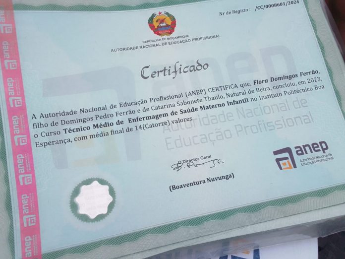 “Neste momento, o Instituto Politécnico Boa Esperança tem em sua posse certificados de qualificação profissional emitidos pela ANEP, uma vez que havíamos dito que estávamos a trabalhar no sentido de resolver esta procura de certificados por parte dos graduados no nosso IPOBEN, nas delegações de Nampula e Nacala, isto é, a partir do dia 18 de fevereiro começamos a fazer levantamento no ANEP dos certificados e faremos a entrega. De salientar que este é o primeiro lote que contem 800 (oitocentos) certificados e esperamos receber, posteriormente, outros cuja entrega será feita massivamente no dia 8 de Março,” declarou.
