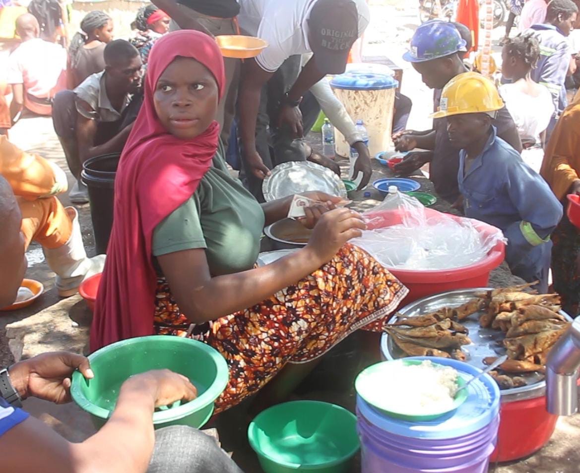 No mesmo espaço, encontramos Zinha Antônio, de 24 anos de idade e mãe de 3 crianças, a servir um prato de arroz acompanhado com feijão. Diferente de Amélia, Zinha está no negócio há um ano e as suas refeições são vendidas ao preço de 40,00Mt (quarenta meticais).